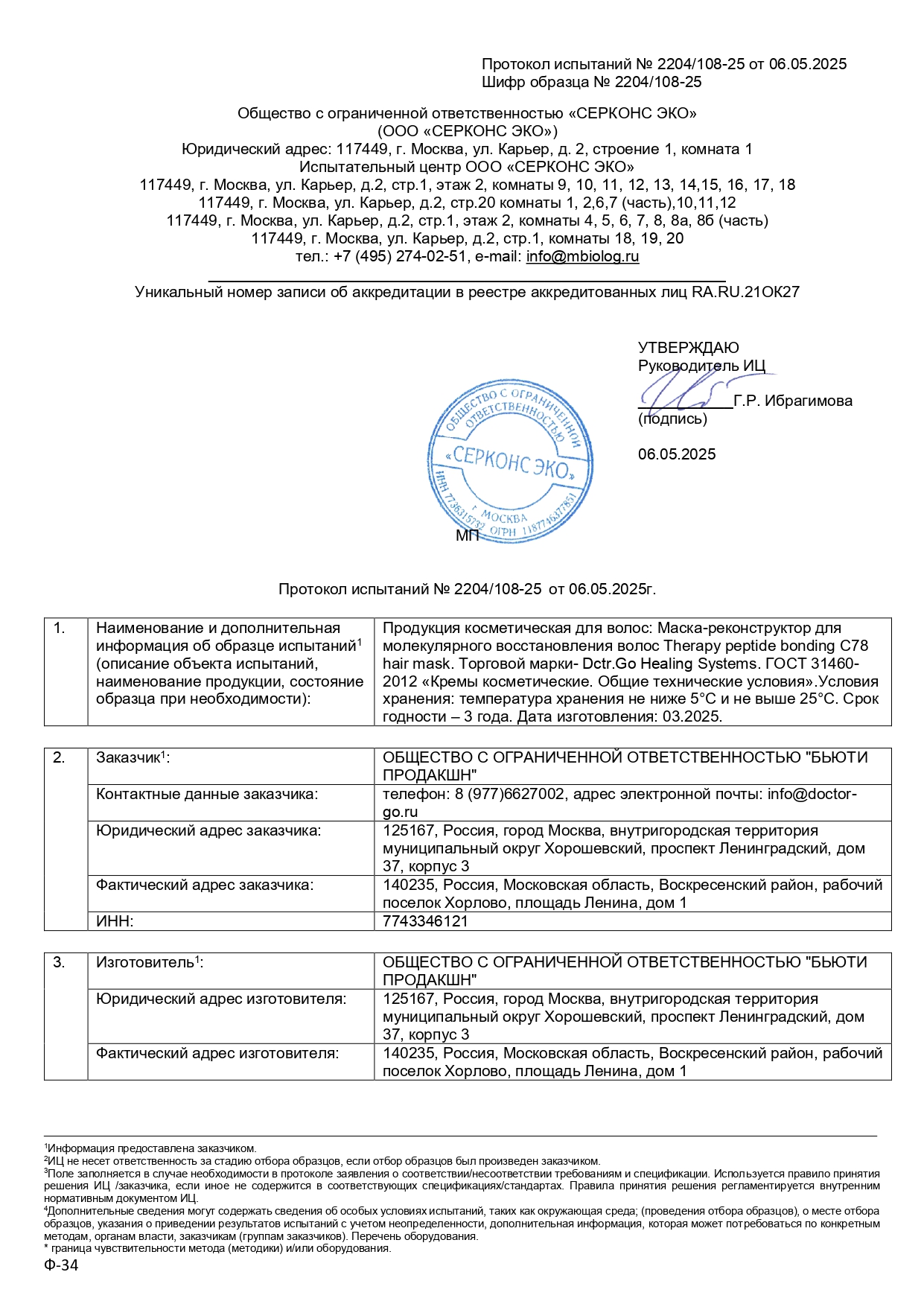 Вложимость в коробках (кол-во шт в 1 коробке): 20 Анонс: Супер ХИТ! код ТН ВЭД: 3305900009 Бренд: DctrGo Healing Systems Вес: 0,05 Производитель: ООО Бьюти продакшн Страна производитель: Россия Тип упаковки: Ваакумный диспенсер Сезон: Всесезонный продукт Год создания: 2024 Нишевая парфюмерия: Tiziana Terenzi Kirke Extrait de Parfum Название модели: Peptide Bonding 78 Класс опасности товара: не опасен Пол: унисекс Область использования: Москва Эффект: Молекулярное восстановление Тип волос: Для всех типов волос Единиц в одном товаре: 1 Условия хранения: от +5 до + 25 Способ применения: Нанести на влажные волосы после шампуня Срок годности: 36 мес - 2 отзыва к товару Несмываемая маска для восстановления волос после окрашивания и осветления Therapy peptide bonding C78 hair mask в Новокузецке
